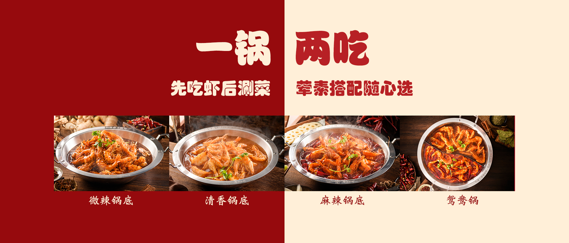 食材精選進口大蝦,搭配秘制底料制作而成,研發出一鍋兩吃的飲食模式(先吃蝦后涮菜,葷素搭配隨心選),打造出綠色健康的飲食新文化。